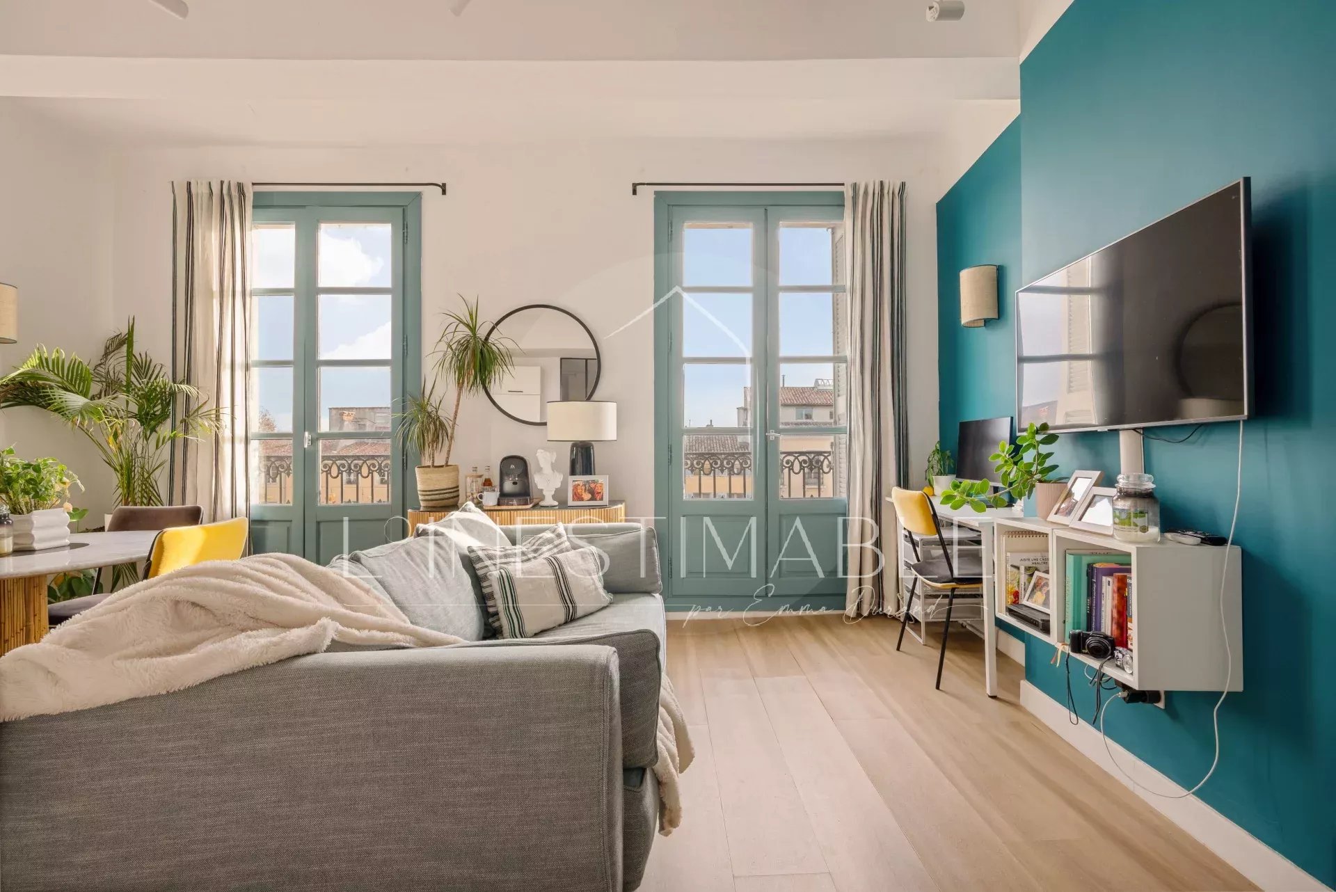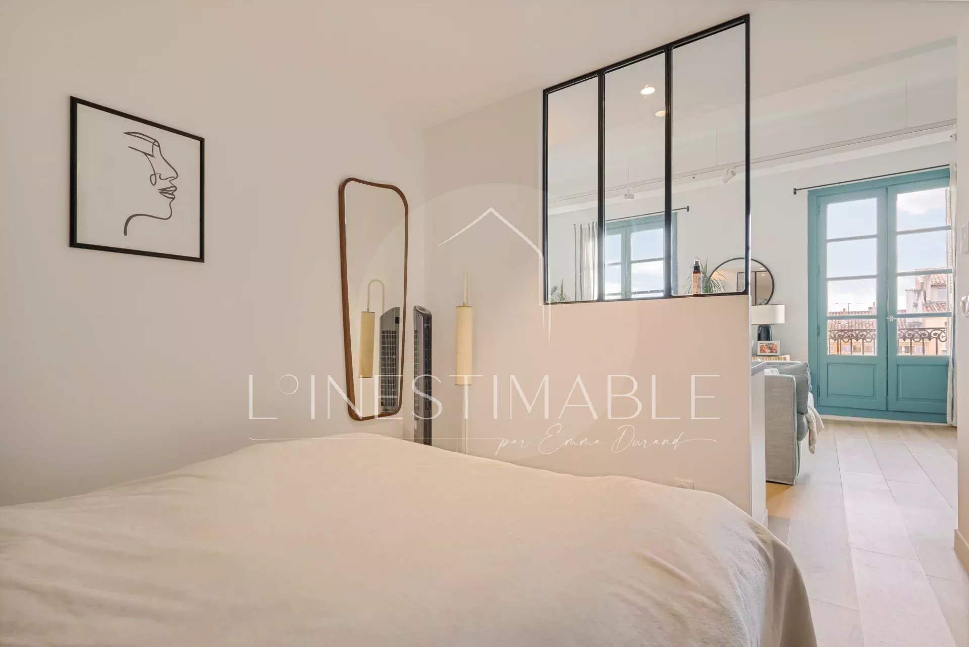 L'appartement est entièrement meublé et décoré avec goût (Sarah Lavoine) et offre des prestations haut de gamme. La pièce principale est dotée de deux grandes fenêtres dont une porte fenêtre ouvrant sur un balcon filant d'où vous pourrez profiter d'une vue imprenable sur tout le Cours Mirabeau. L'espace cuisine, subtilement intégré au séjour, est entièrement équipé, le coin nuit largement éclairé par une verrière donnant sur le salon.